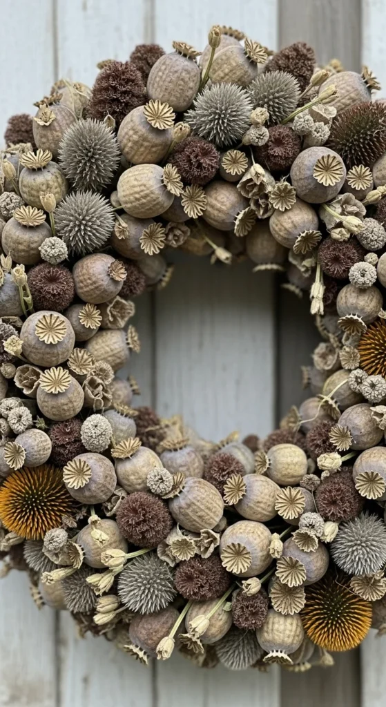Use dried seed heads from summer flowers for a textured, natural wreath. Their muted tones look sculptural and artistic. Mix sizes for variety, and leave stems visible for a raw, organic finish.
