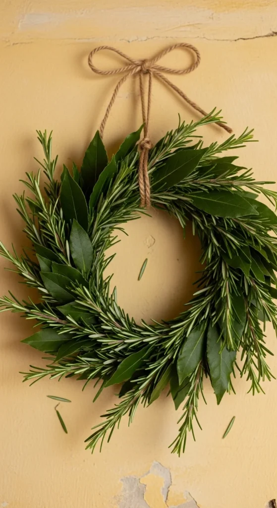 Herb wreaths smell amazing indoors. Combine rosemary and bay leaves into small bundles, then wire them around a ring. Hang it in your kitchen or dining area for a touch of greenery. It dries beautifully and doubles as a source for fresh herbs while cooking.