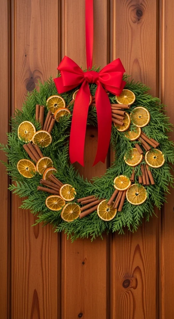 Slice oranges thinly and dry them in the oven. Mix them with cedar greens, cinnamon sticks, and a festive bow. The combination of scents—citrus, pine, and spice—creates a warm seasonal aroma. Hang it near an entryway for a natural welcome.
