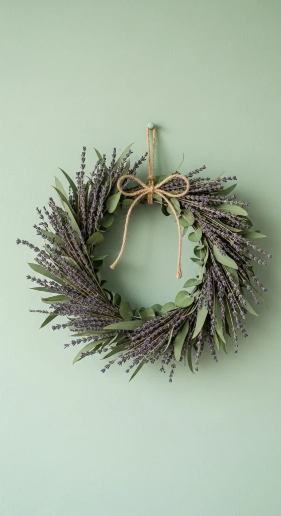 This soothing combo brings color and fragrance to winter spaces. Use a grapevine or wire base and layer eucalyptus stems, then lavender sprigs on top. The result is calming and elegant. It works year-round and holds its scent for months.
