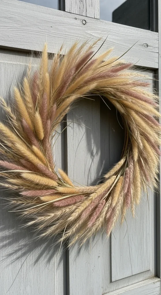 Cut dried grass plumes like pampas or miscanthus for an airy, soft design. Attach them to a wire hoop with floral tape. The texture catches light beautifully indoors. Keep it simple — its beauty comes from movement and shape.