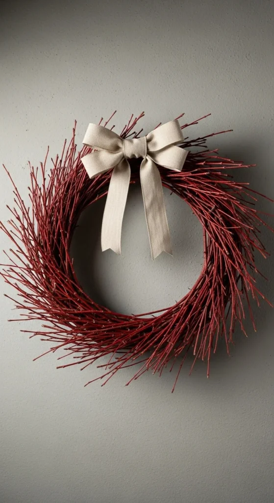 Dogwood branches bring striking color and structure. Gather several twigs, bend them into a circle, and secure with wire. Add evergreen sprigs for depth. It’s bold, minimal, and perfect for modern homes.
