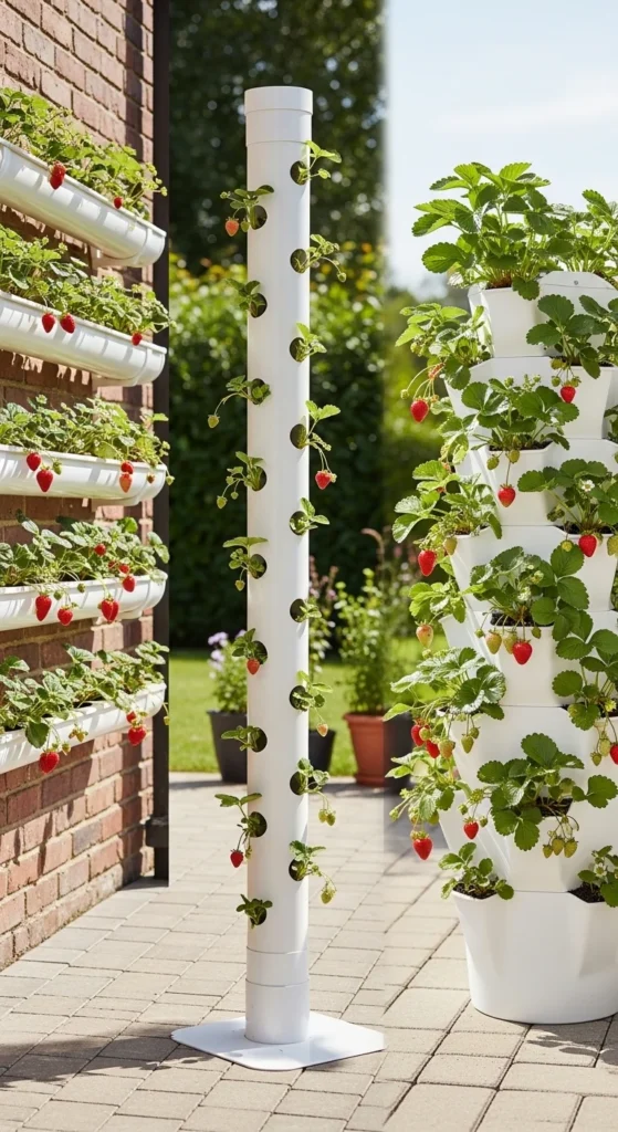 Vertical strawberry gardens are one of the smartest small-space hacks ever. Towers, gutters, pipes, and stackable planters can grow dozens of plants in the footprint of a single pot — and they look amazing too.