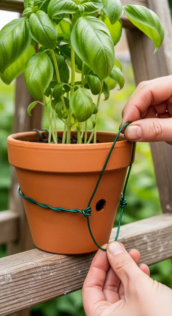 Method A: Wire terra cotta pots to the rungs (super rustic)