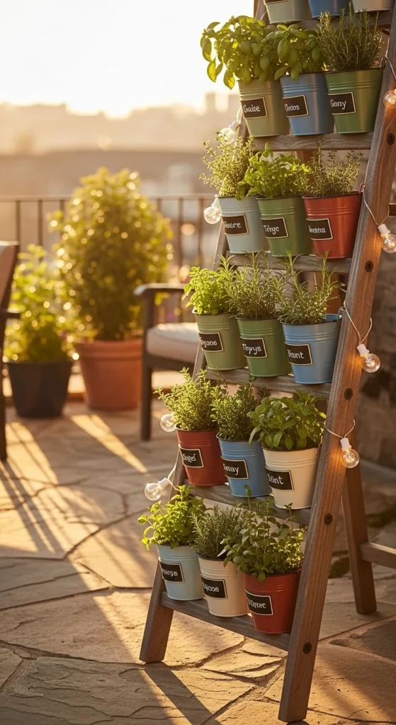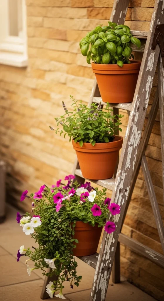 A ladder garden gives you instant height, built-in tiers, and that cozy rustic look that makes patios and balconies feel like a Pinterest dream. Add a few pots, some trailing flowers, and a handful of herbs—and suddenly you’ve got a showpiece that’s also practical.