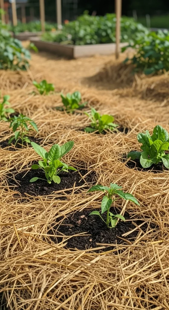 Apply mulch 2–3 inches thick, keeping it slightly away from plant stems.