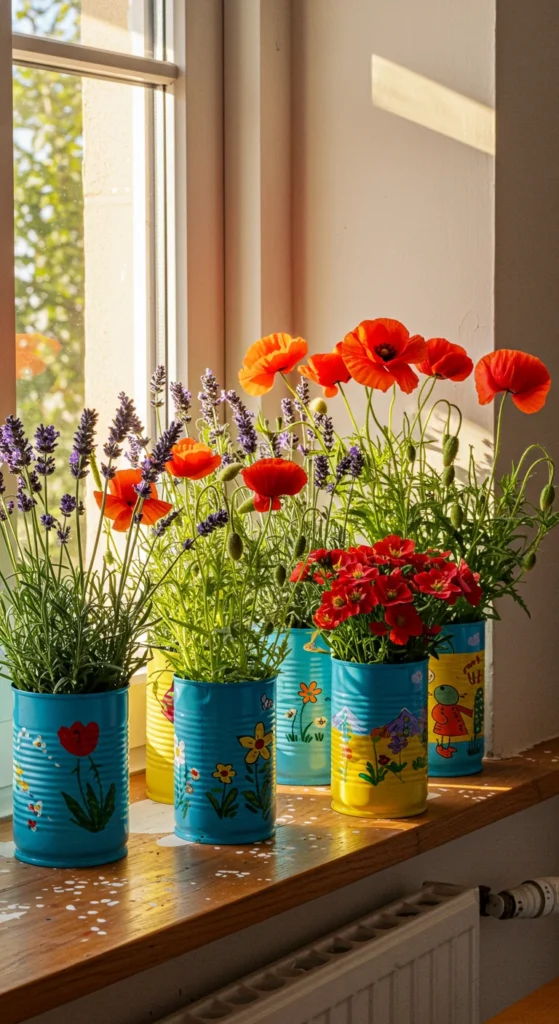 Tin cans make excellent planters once cleaned and decorated. Drill drainage holes and paint them for personality. Plant small herbs or succulents in them. They’re budget-friendly and a fun DIY project.