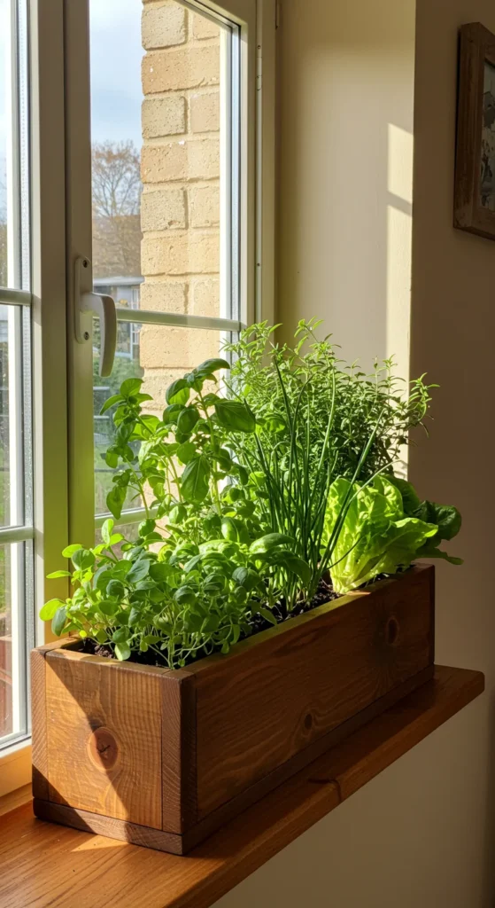 Indoor window boxes maximize sunlight exposure. Plant fast growers like lettuce, spinach, or herbs. A box fits neatly on a wide windowsill. With easy access, you can snip greens for meals anytime.