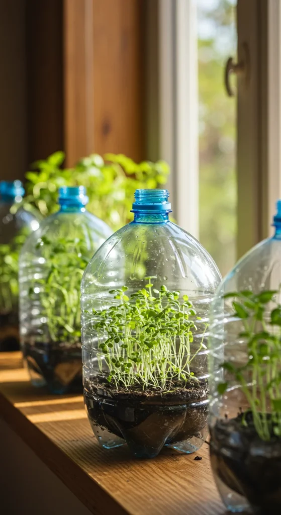 Repurpose plastic bottles by cutting them in half. Place the top half over seedlings to create mini greenhouses. This traps heat and moisture, helping young plants grow stronger indoors. It’s an easy zero-cost trick.