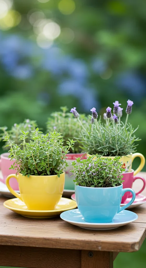 Teacups make adorable herb planters. Drill a drainage hole or add pebbles before soil. Place them on a kitchen shelf or table. It’s a charming way to add greenery in small spaces.
