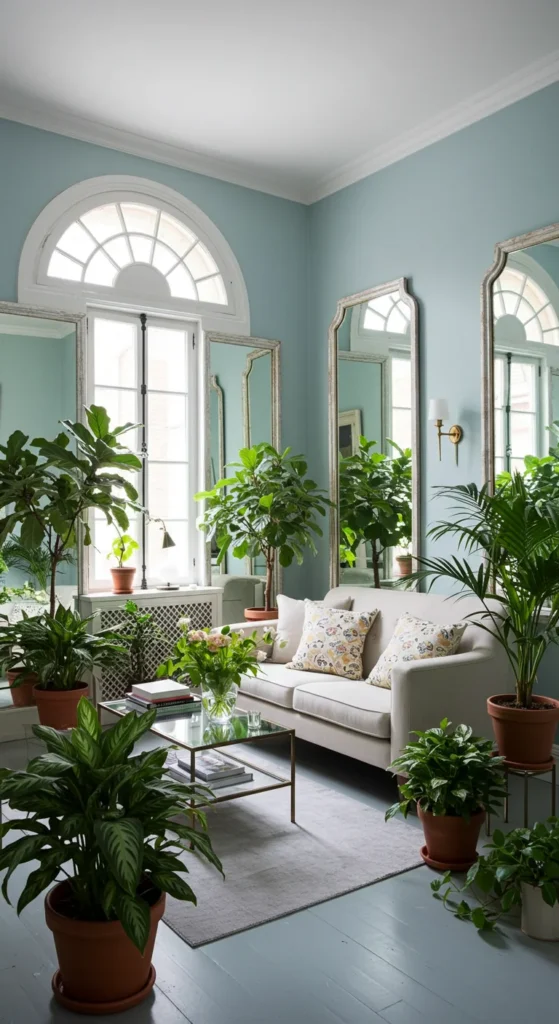 Mirrors can make a space brighter for plants. Position them behind pots to reflect natural light. This helps plants grow better in dim corners. It’s also a trick to make small rooms feel larger.