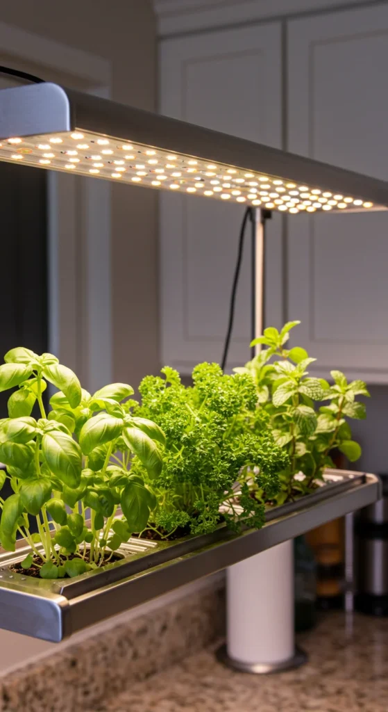 Not every apartment gets sunlight. Grow lights fix that problem. Install affordable LED strips above shelves or on stands. Provide 12–14 hours of light daily for herbs and leafy greens. This lets you garden anywhere, even in windowless rooms.