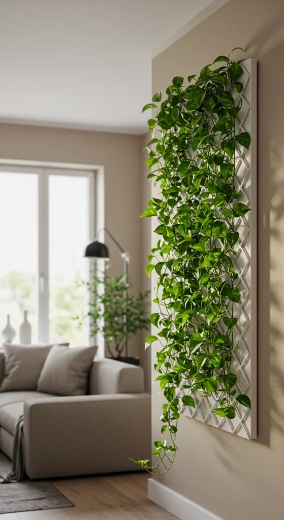 Climbing plants like pothos or philodendron add height without taking up floor space. Train them on wall trellises or poles. They’re easy to maintain and bring dramatic greenery indoors.