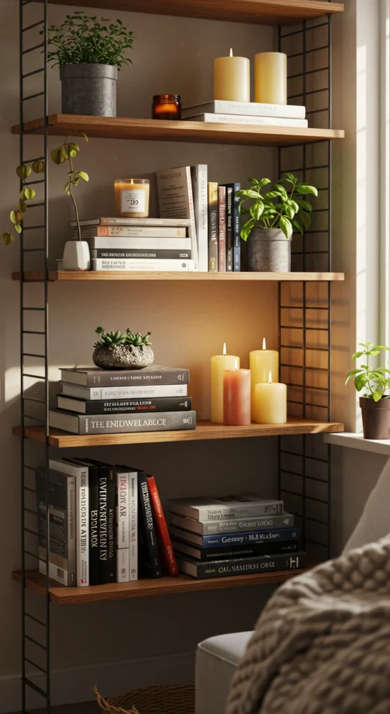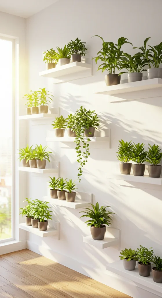 Floating shelves free up ground space and let you build a green wall effect. Arrange small pots of herbs or decorative plants in rows. Position them where they get enough light. It’s a modern way to fit more greenery into compact apartments.
