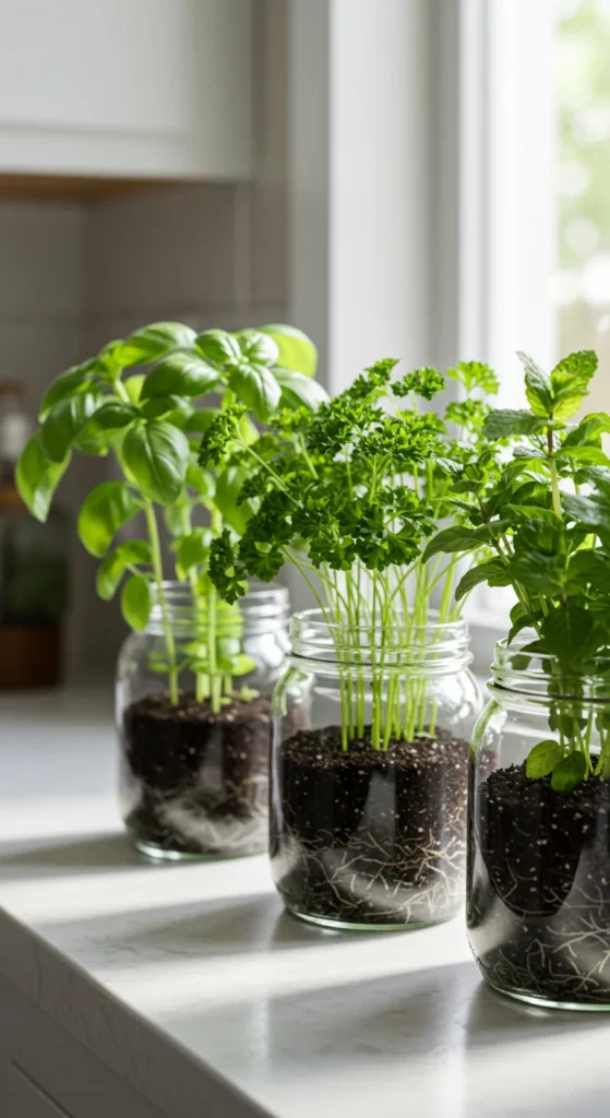 Mason jars are simple yet stylish. Fill them with potting mix and grow small herbs like basil or parsley. Place them on a sunny kitchen shelf for easy access when cooking. Add a layer of pebbles at the bottom for drainage. This setup is cheap, practical, and attractive.