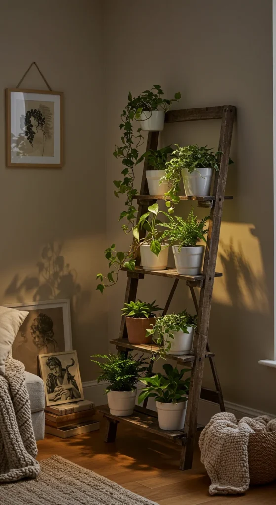 A ladder shelf makes an instant vertical garden. Place potted herbs, flowers, or houseplants on each step. It’s perfect for apartments where floor space is limited. Moveable shelves allow you to rearrange plants easily. It doubles as both storage and greenery.