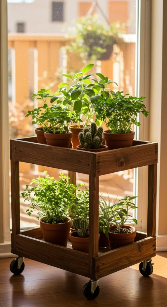 Rolling carts give flexibility. Move plants around to catch the sun or free up space when entertaining guests. Place herbs, leafy greens, or small flowers on each tier. A cart keeps everything organized and portable.