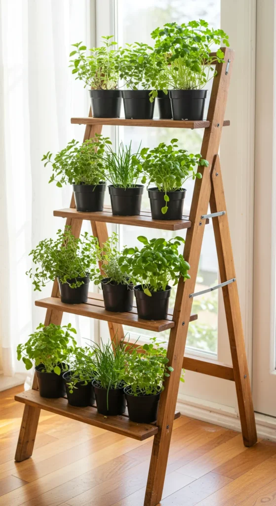 A ladder shelf adds both style and vertical space. Place herbs that need the most light on the top shelf and shade-tolerant ones like mint on the lower levels. It turns a small corner into a green, functional focal point.