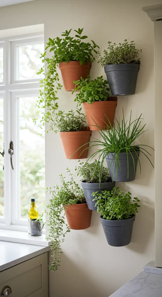 Running out of counter space? Go vertical! Use hanging planters or wall-mounted containers to grow herbs like basil, oregano, and rosemary. It saves space and doubles as living wall art. Use lightweight containers and hang them near a window for sunlight. Choose trailing herbs for extra visual appeal.