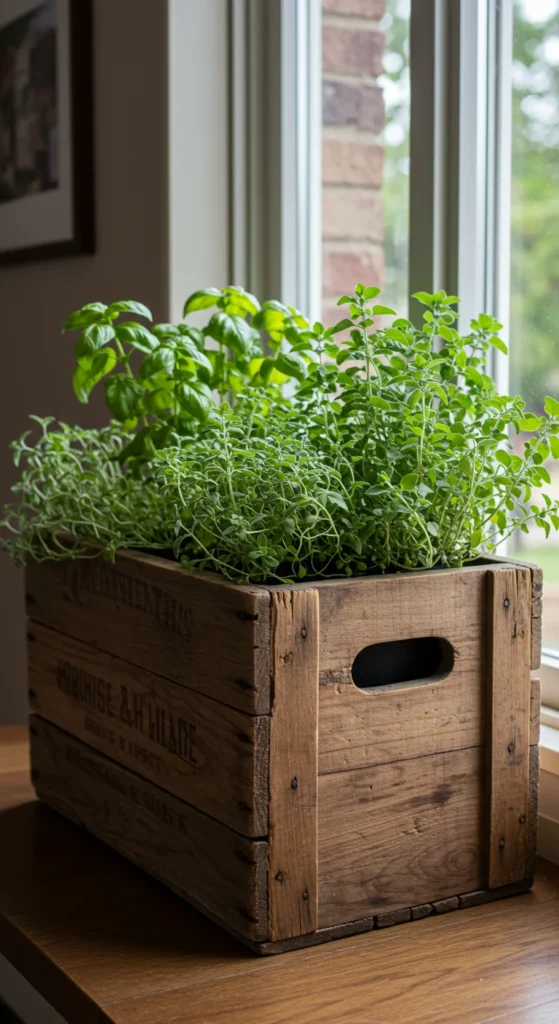 Old wine crates make beautiful multi-herb planters. Line the crate with plastic to prevent leaks, fill with soil, and plant a mix of herbs. It fits perfectly under a sunny window or on a balcony. The rustic look pairs beautifully with green leaves, creating a farmhouse feel even in small apartments.