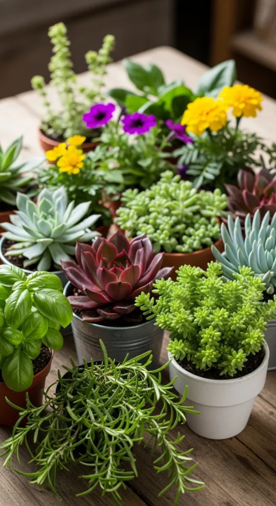 - Succulents: Sedum, echeveria, and string of pearls for low maintenance.