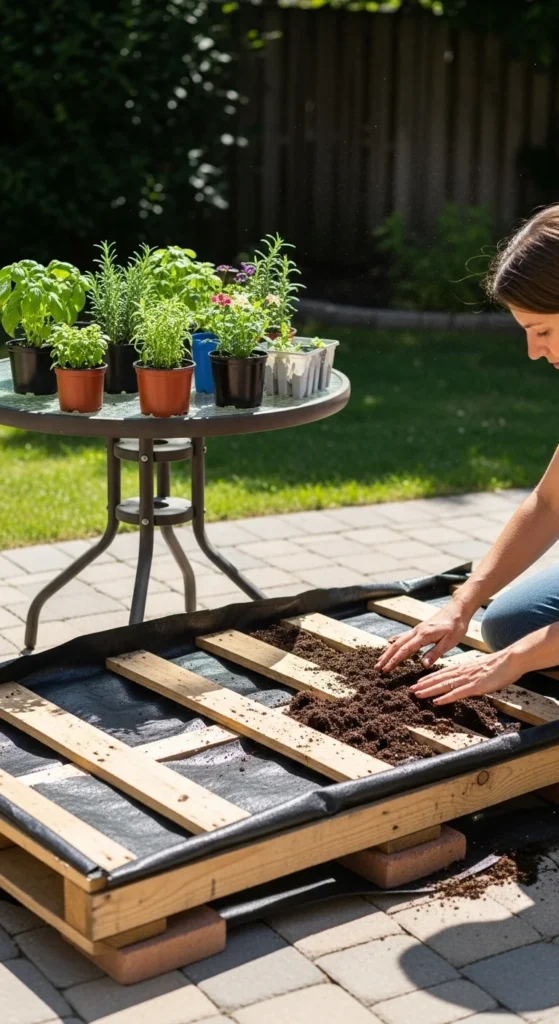- Wooden Pallet Garden: Recycle a pallet, line it with landscape fabric, and fill the gaps with soil and plants.