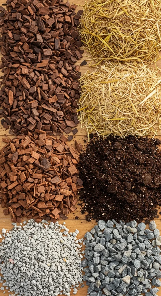 - Wood chips or bark – Long-lasting and great for shrubs and trees.