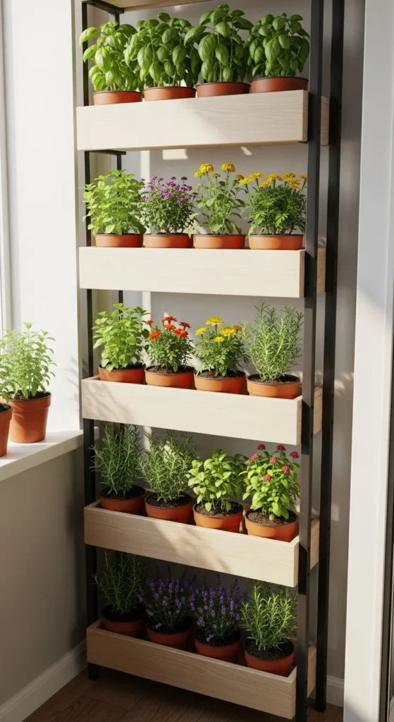 A ladder shelf fits well in any corner and adds height. Place taller plants on the lower steps and small ones on higher levels. This keeps the shelf balanced and visually tidy. You can build a simple ladder shelf using leftover wood planks. Add a coat of waterproof sealant. Herbs like thyme or coriander work well here. This keeps your balcony uncluttered while still giving room for multiple plants.
