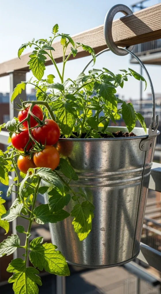 Use a hanging bucket for tomatoes to save floor space. Drill a hole at the bottom, plant a tomato seedling upside down, and fill the bucket with soil. Hang it from a strong hook. Tomatoes grow downward easily and stay compact. Keep an eye on watering as hanging containers dry quicker.