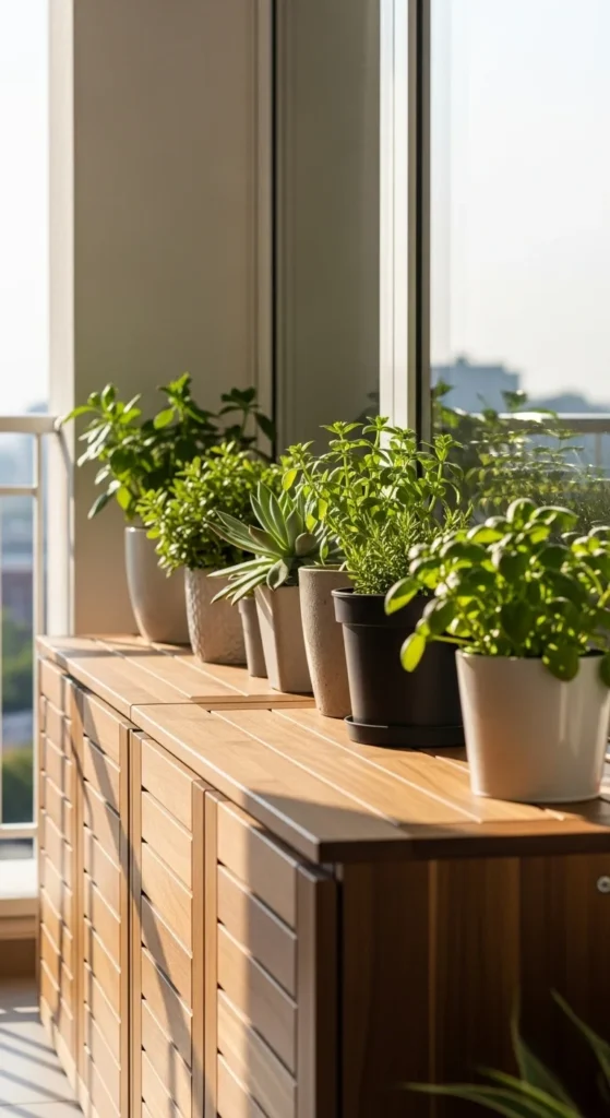 A slim bench offers seating and plant display space. Store tools or soil bags underneath. Place a few small pots on the bench top. This keeps your balcony both beautiful and functional. Choose weather-resistant wood or metal. Add a cushion for comfort.