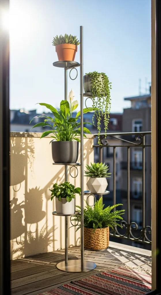 A multi-level stand expands planting space upward. Each level holds a pot without touching the others. Use it for plants with different light preferences. Keep heavier pots on the bottom. This type of stand is easy to move around when you want to clean or rearrange your balcony.