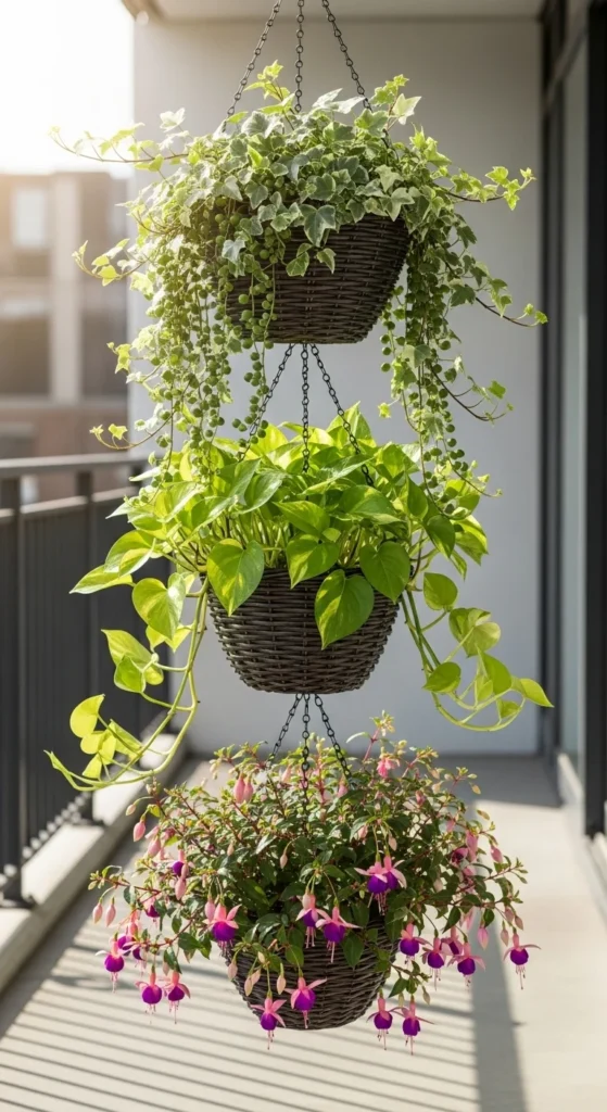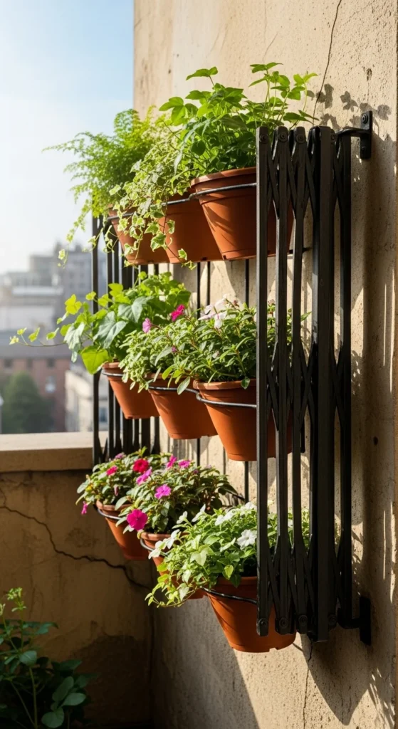 A fold-up rail creates instant space for pots. Hang several lightweight planters and fold the rail up when needed. This is helpful for tiny balconies. Choose trailing plants to make the most of the vertical space. Keep watering simple by using self-watering inserts.