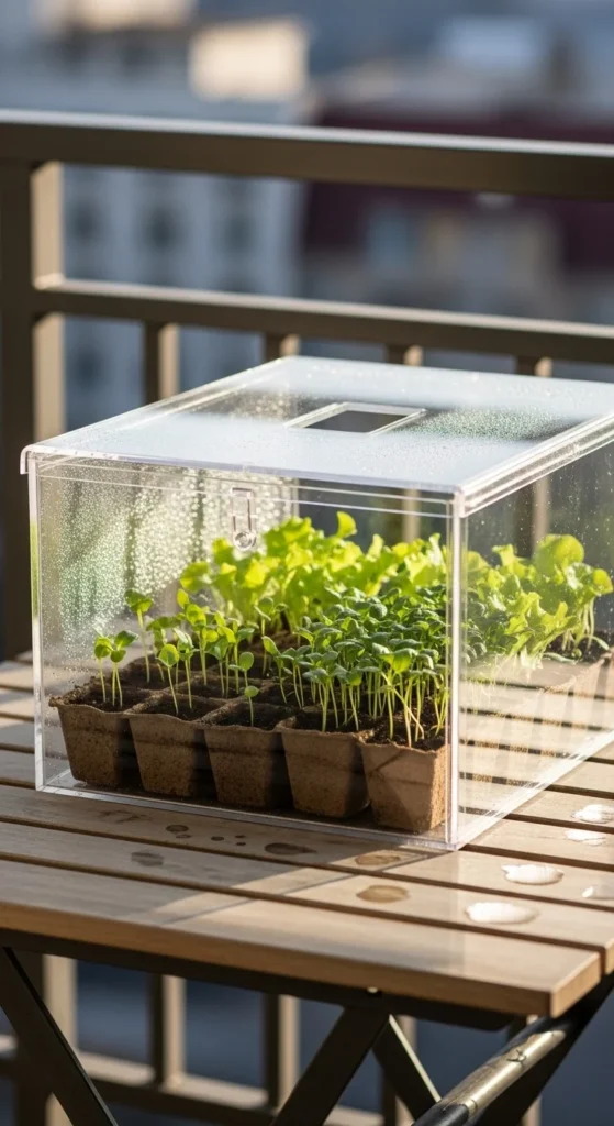 A mini greenhouse box protects seedlings from cold winds. Place it on a table or corner shelf. Use it to start vegetables or herbs early in the season. Ventilate it on warm days. This compact structure fits easily on any balcony.