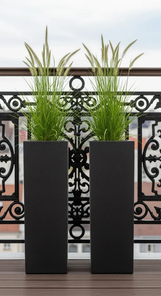 Tall planters help create privacy and save space. Choose narrow designs and place them against the railing. Add upright plants like bamboo or lemongrass. These grow tall without spreading. This approach adds greenery while keeping walking space open.
