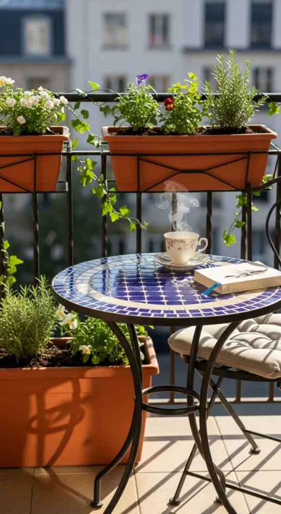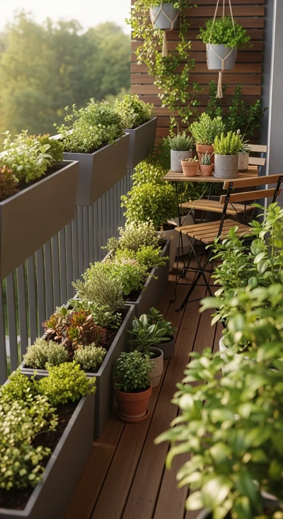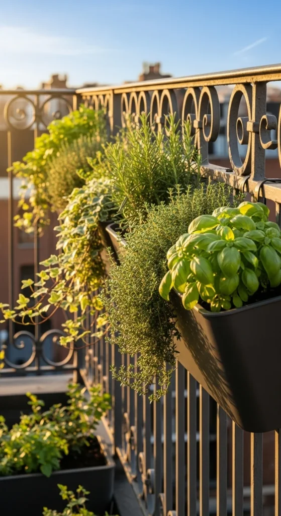 Railing planters free up the entire floor. Clip them securely and choose narrow styles to keep the walkway open. Plant hardy herbs like rosemary, oregano, or small flowers. These get direct light and grow well in shallow containers. If you’re on a budget, repurpose plastic bottles by cutting them lengthwise and attaching them with zip ties. Keep the soil light and water in small amounts. This setup gives you a clean line of plants without losing any space.
