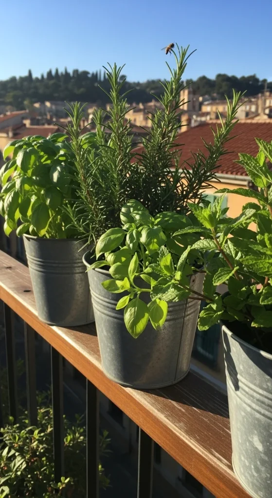 Mount small buckets along the railing to form a mini herb station. Drill holes for drainage and secure them with strong clamps. Grow quick-harvest herbs like chives or basil. This keeps your herbs close to the light and off the floor.