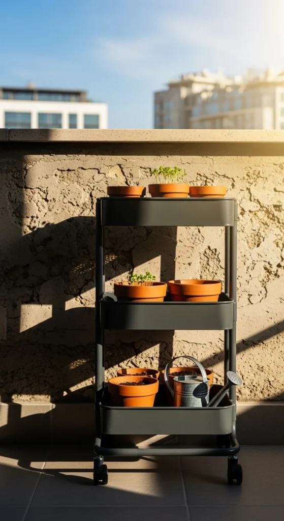 A fold-away rolling cart works well for rearranging plants. Move it around to adjust light exposure. Fill the shelves with small pots and group them by watering habits. When not needed, fold or roll it inside. This keeps your garden flexible and neat.