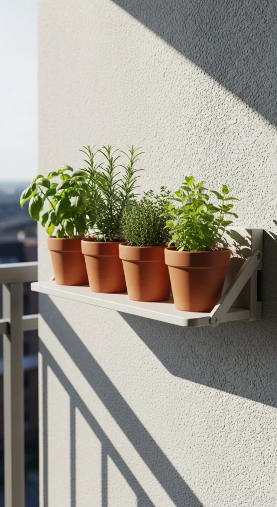 A foldable shelf helps save space when not in use. Mount it on a strong wall and add a few lightweight pots. You can fold it down while watering or pruning. Use it for small herbs, succulents, and compact greens. This idea works great for renters too, as it keeps everything neat and off the floor. Paint the shelf to match the balcony style if you want a clean look.