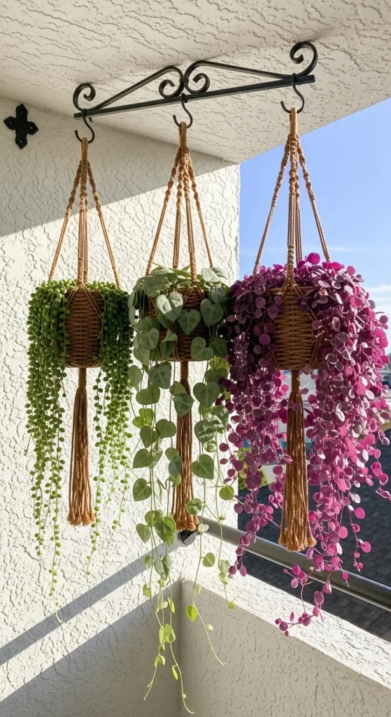 Hanging baskets bring plants upward and clear your seating area. Choose lightweight baskets and fill them with trailing ivy, strawberries, or small ferns. Use a three-piece hook set for balance. Water lightly as hanging pots dry faster. This is an easy way to grow more plants without using floor space. If you prefer a DIY approach, crochet simple hangers with cotton rope.