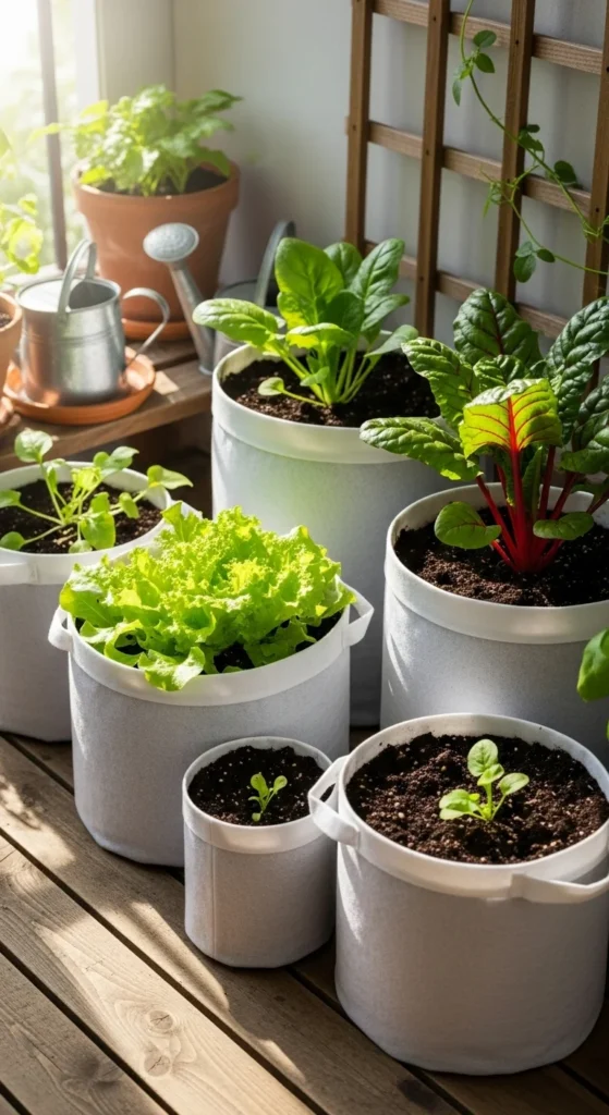 Grow bags are lightweight and great for balconies. Add lettuce, spinach, or tomatoes depending on sunlight. Keep bags in one corner to save walking room. They drain well and fold away when not in use. Choose bags with handles for easy moving. You can place a tray underneath to keep the floor clean. This is a simple option for growing vegetables without heavy pots.