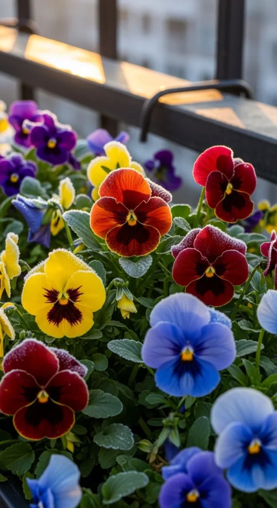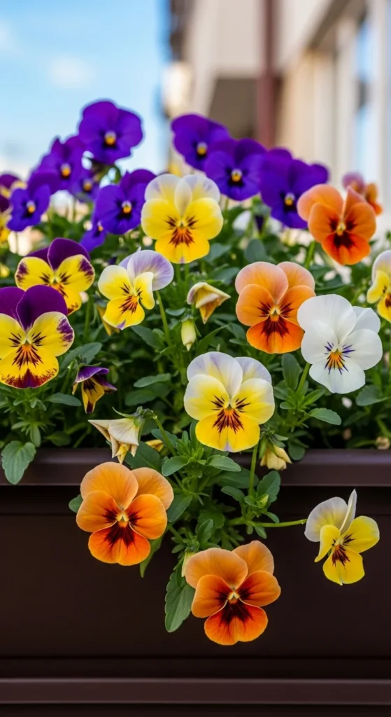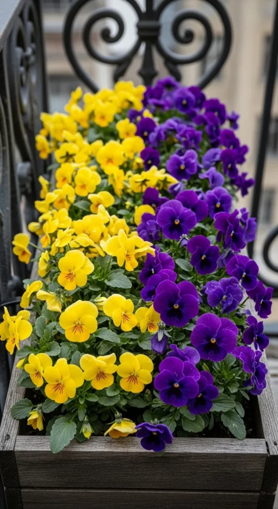 Pansies keep color even in cold weather, making them perfect for balcony rail boxes. Pick sturdy varieties with strong faces and mix different shades to create contrast. Keep the soil slightly moist and let the box drain well. A narrow rail box works best so the flowers sit at eye level.