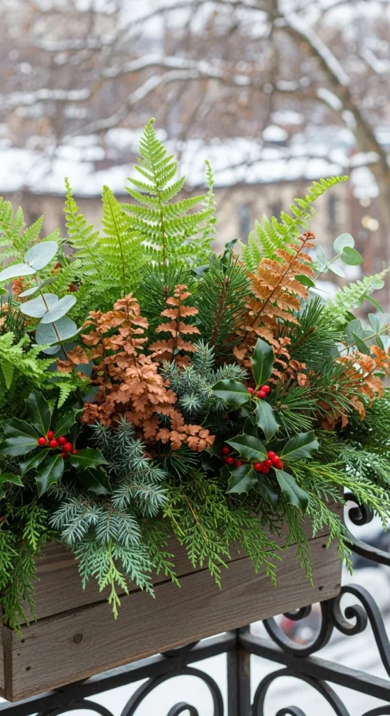 Hardy ferns stay lush during winter. Pair them with evergreen sprigs for structure. Keep soil moist during dry winter days.
