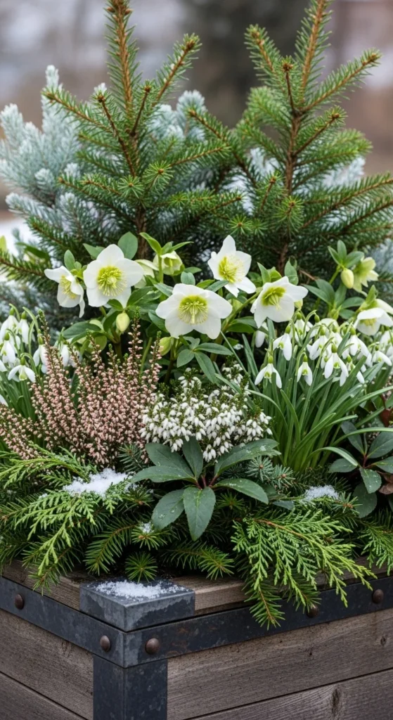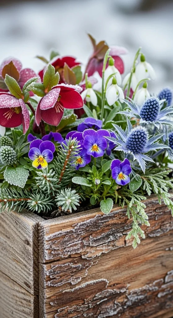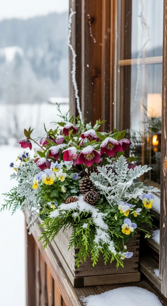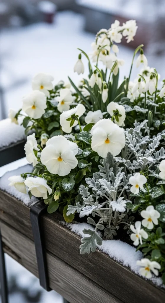 White flowers reflect winter light beautifully. Combine dusty miller, white pansies, and light greenery for a soft winter glow. Keep the box near the railing for the best view.
