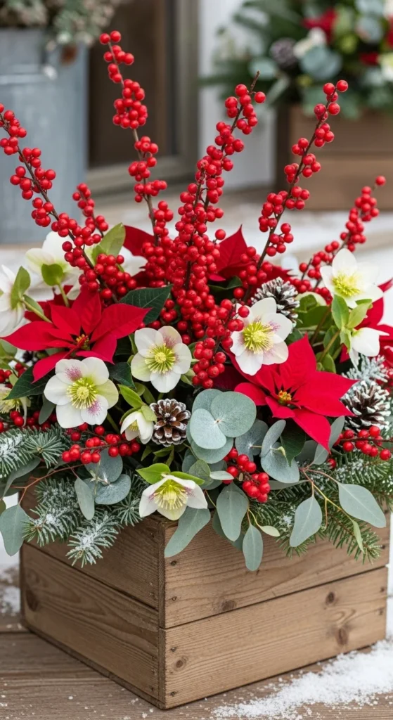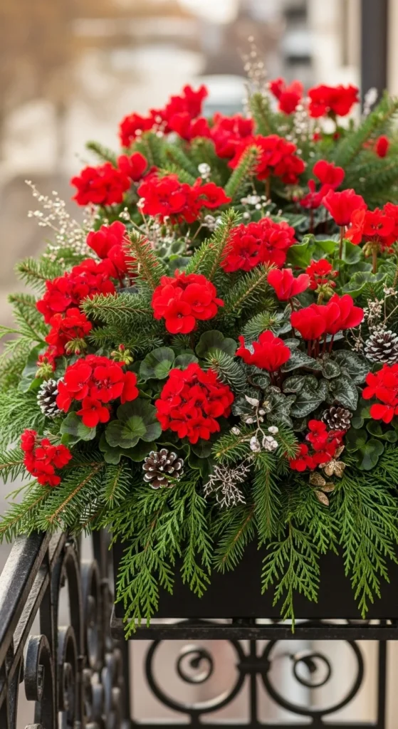 Create a festive winter look with red cyclamen and green pine sprigs. Add pinecones for texture. This box stays bright even during cold mornings.