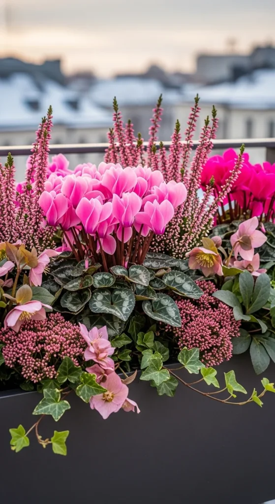A pink palette softens a cold balcony. Combine cyclamen, violas, and dusty miller for a gentle mix. Keep the soil lightly moist.