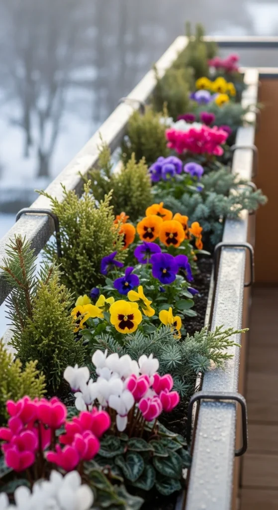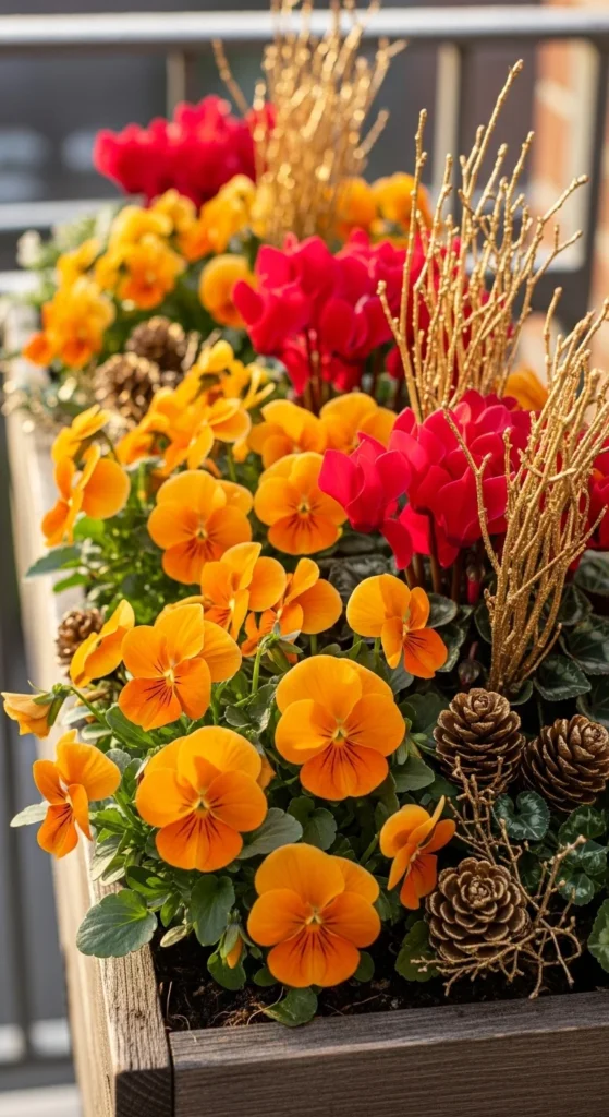 Warm tones bring energy to winter balconies. Mix orange pansies, red cyclamen, and small yellow violas for a cheerful arrangement.