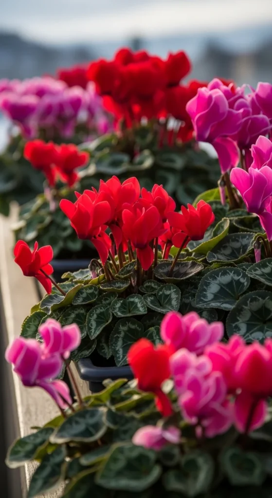 Cyclamen offer strong winter color with their curled petals and patterned leaves. Plant several colors together for a cheerful display. Keep the soil lightly damp but avoid watering directly on the plant crowns. These flowers enjoy cool air, making them perfect for balconies.