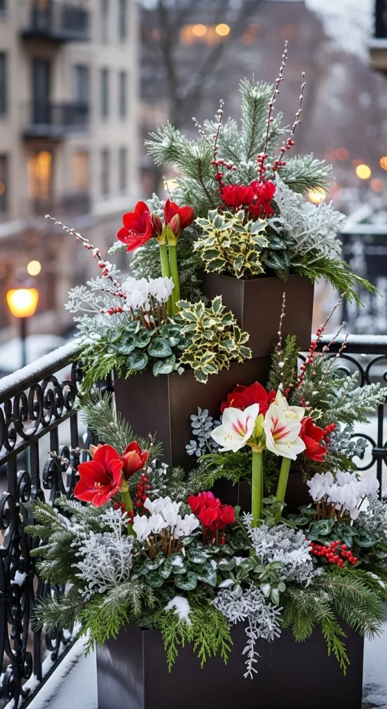Add artificial or real berry sprigs to brighten your balcony. Pair them with evergreens or cyclamen for contrast. Berry accents stay colorful through cold months.