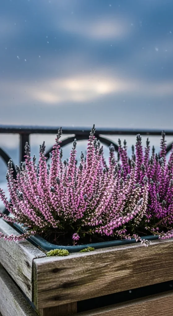 Heather adds a soft, airy look with its tiny flowers. It pairs well with evergreens or pansies. Keep the soil slightly acidic and moist. Heather works well in long rectangular boxes where it can spread gently.
