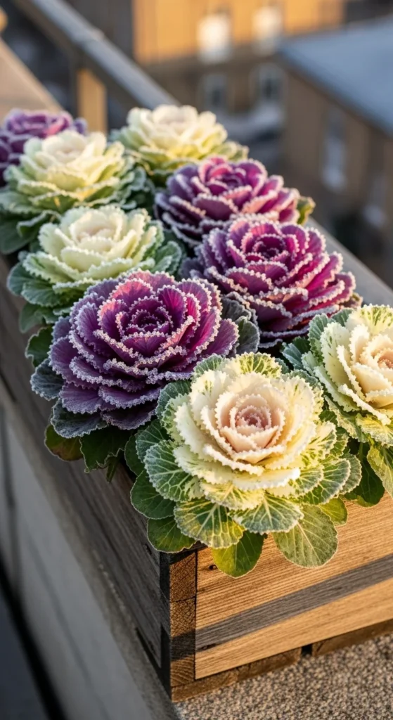 Ornamental kale gives strong winter texture. Its rosettes stay colorful even through frost. Mix different sizes for depth. Keep the soil cool and water lightly.